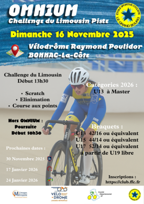 Ensuite, à partir de 13h30, pour les catégories U13 à Master, débutera l'Omnium et ses épreuves (Scratch/Eliminiation/Course aux points).